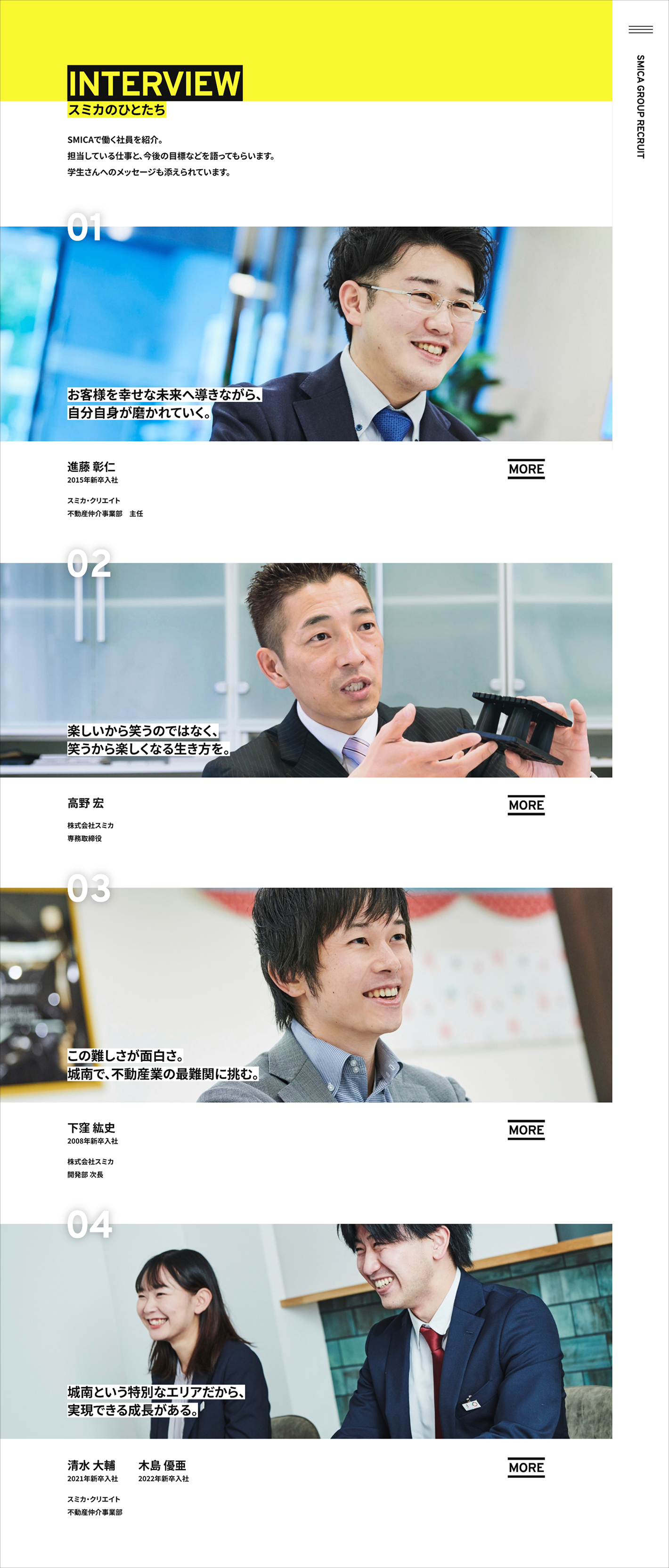 東京・中目黒に本社を構え、城南エリアに密着した不動産事業を展開する株式会社スミカ。採用メッセージの策定、先輩社員のインタビューと執筆、および代表メッセージの執筆を担当しました。メインターゲットは、主体性があり、成長意欲が旺盛な大学生です。城南という最高峰のエリアを新卒1年目から担当でき、パワフルな自己実現を果たせるという同社の魅力を訴求しました。