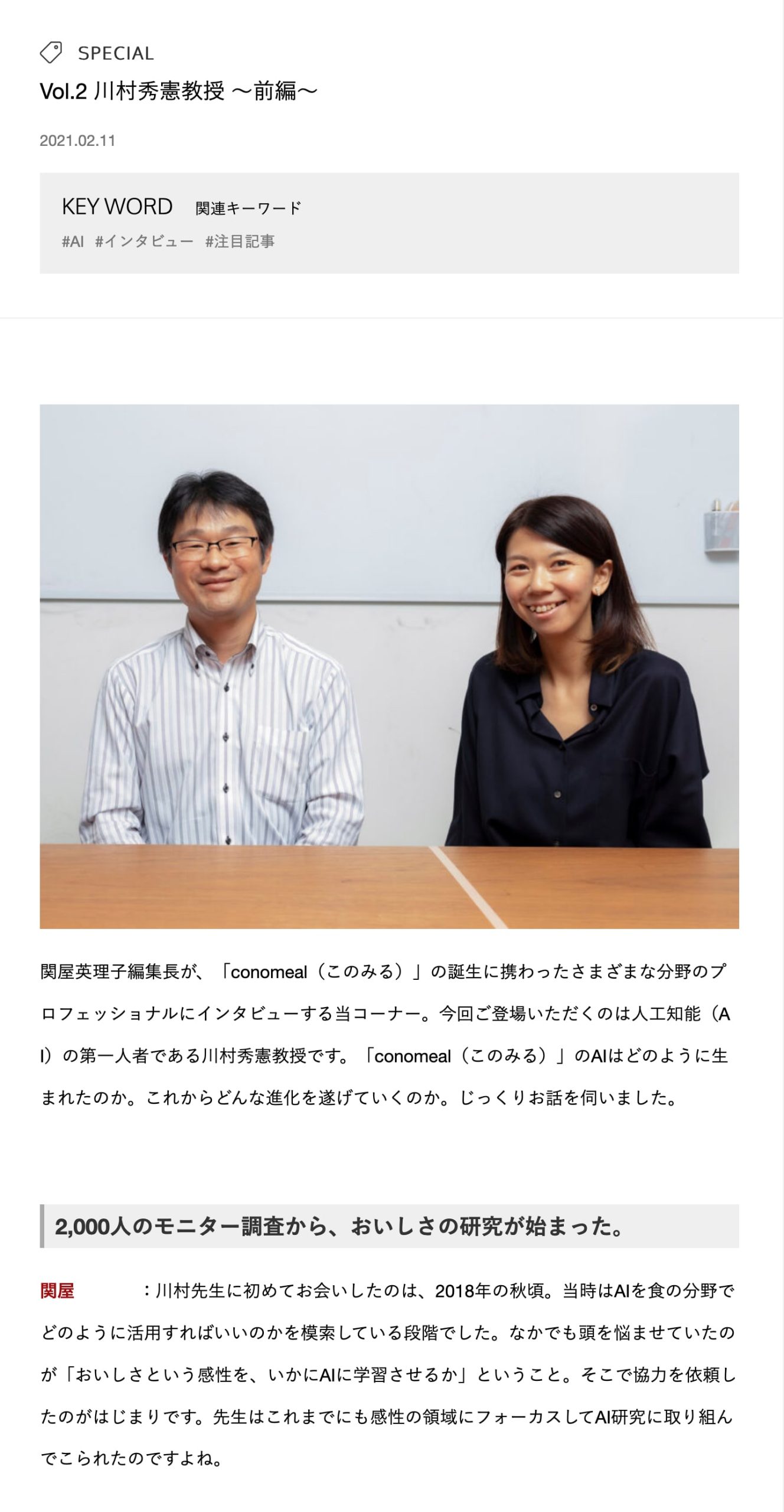 「このみる研究所」は、AIの研究で得られた知見や、食の楽しみ方などを幅広く発信するサイトなのですが、そのなかに「キーパーソンに聞きました」というコーナーを新設しました。取り上げたのは、conomeal(このみる)のレシピアドバイザーを務める盛山貴行シェフ、conomeal(このみる)のAI開発に携わっている川村秀憲教授と杉浦仁志シェフです。3名のインタビュー記事は読者だけでなく、私にとっても大変価値のあるものになりました。