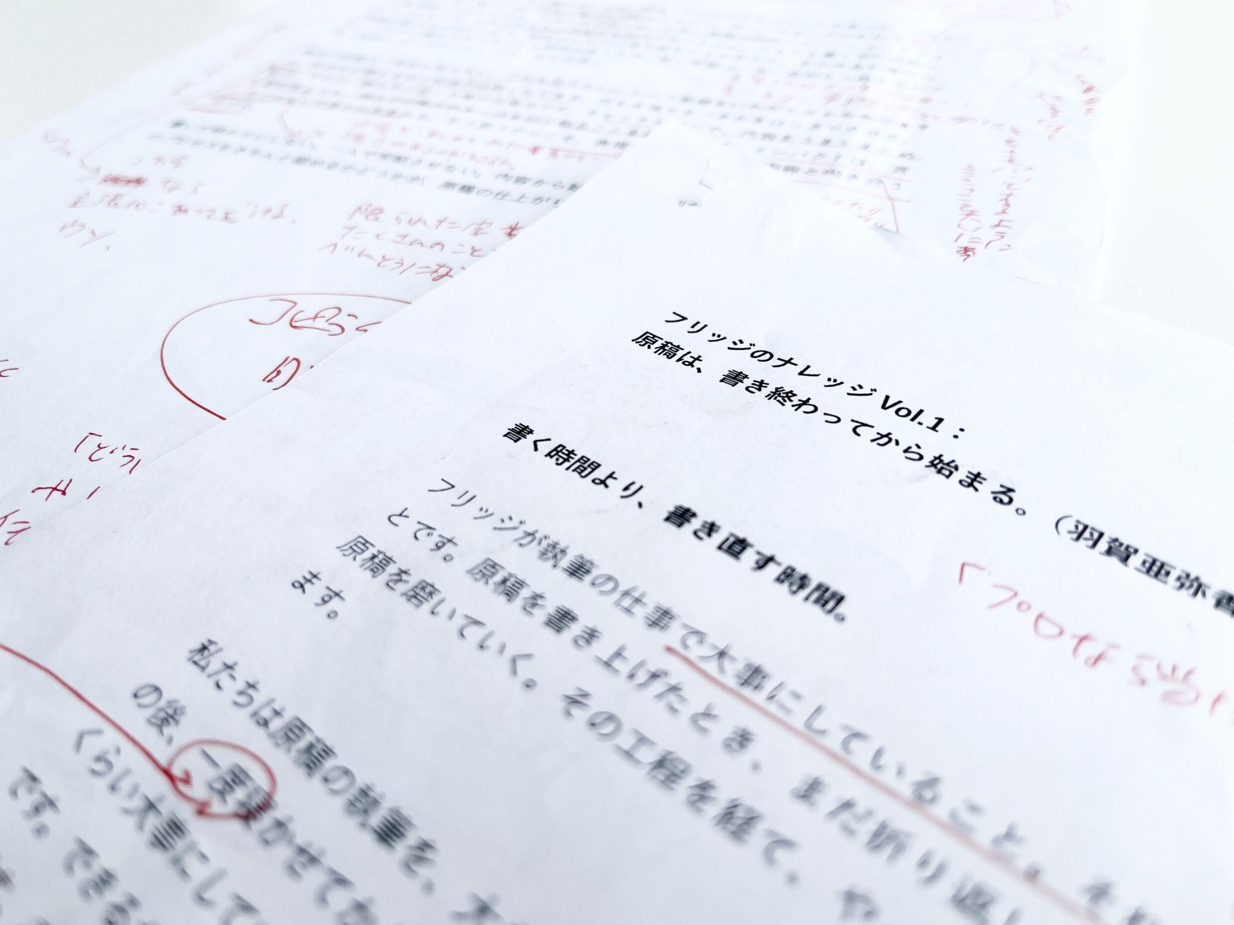 フリッジでは、初稿を形にした後の工程を大切にしています。イメージ的には、初稿段階ではまだ折り返し地点。そこから、なるべく客観的な目をもって原稿を見直し、磨きをかけていく。校正ではなく、しつこい推敲です。これを重ねて、やっと誰かに読んでもらえる文章に仕上がります。