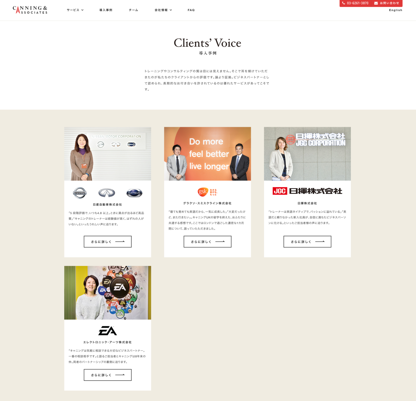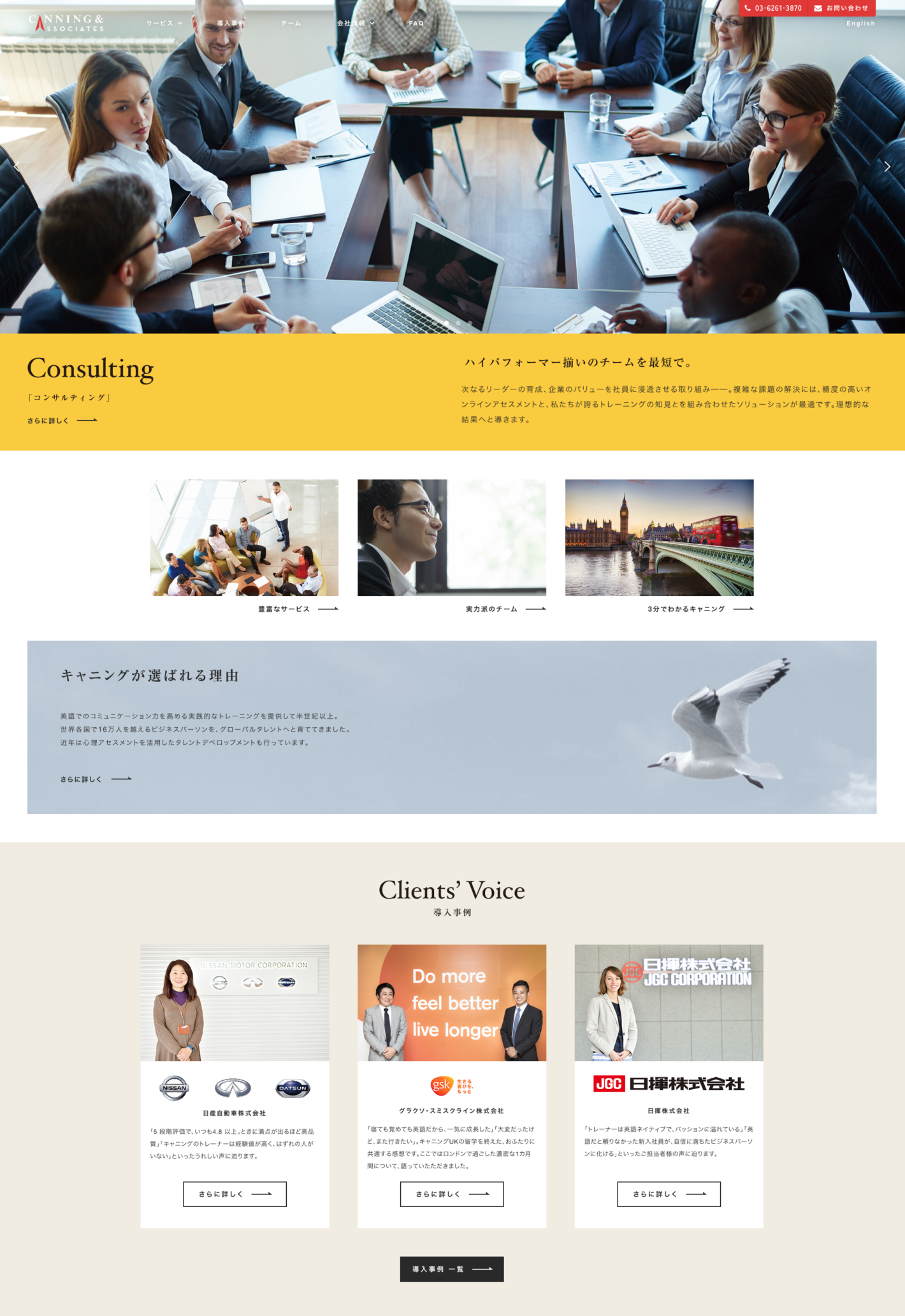 人材開発やトレーニングサービスの提供を幅広く行っているキャニング・アンド・アソシエイツ様の(http://www.canning.co.jp/)のWebサイトのリニューアルを担当させていただきました。また英語版へのローカライズも担当。