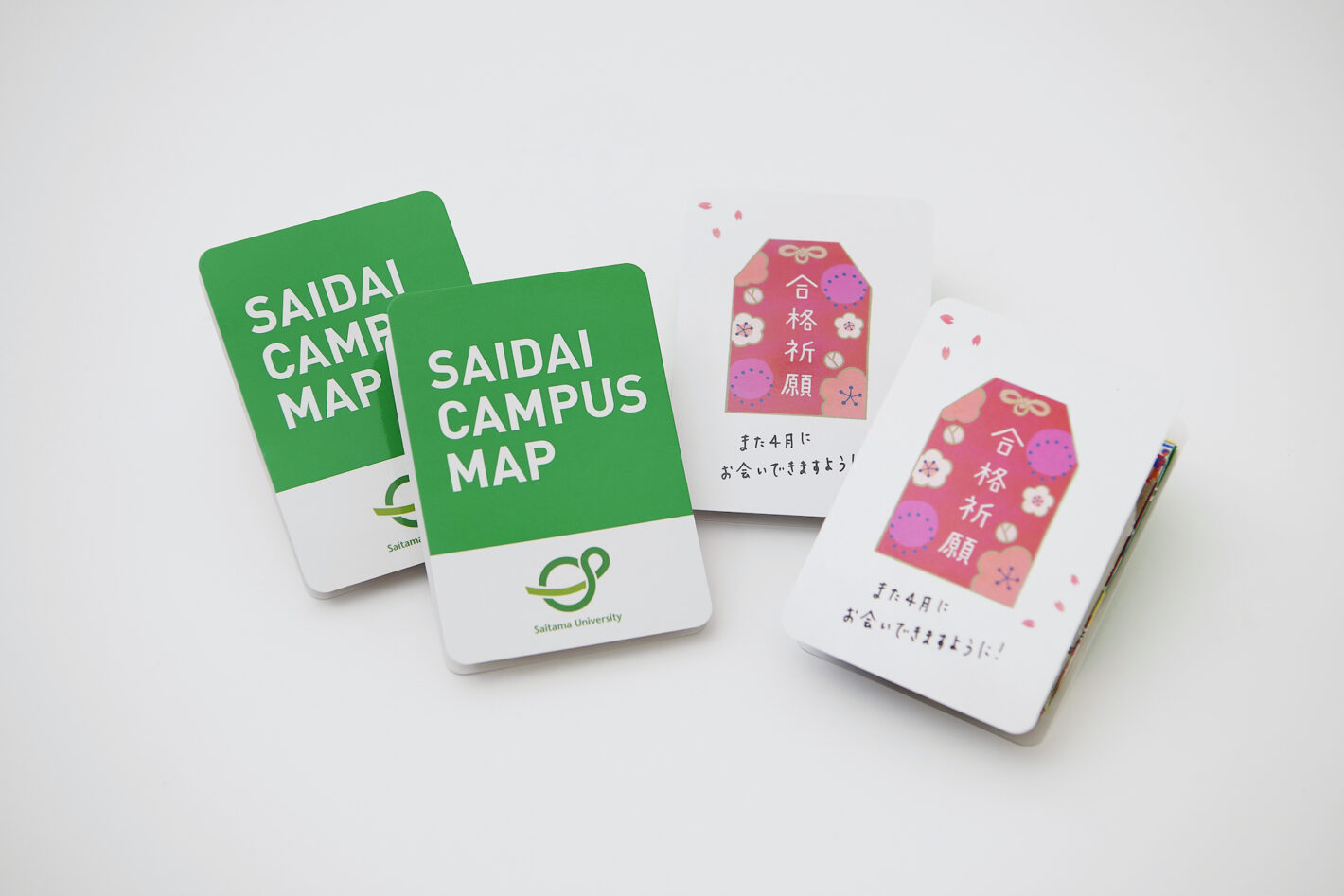 キャンパス訪問した受験生に、学内を探検してもらうためのキャンパスマップです。表面にはマップとモデルコースを、裏面には在学生に埼玉大学の魅力を語ってもらったインタビューコンテンツを掲載。ミウラ折りで仕上げました。裏表紙を、合格祈願お守りにすることで、マップを受け取った受験生にとって、手放せない思い出のアイテムにしました。