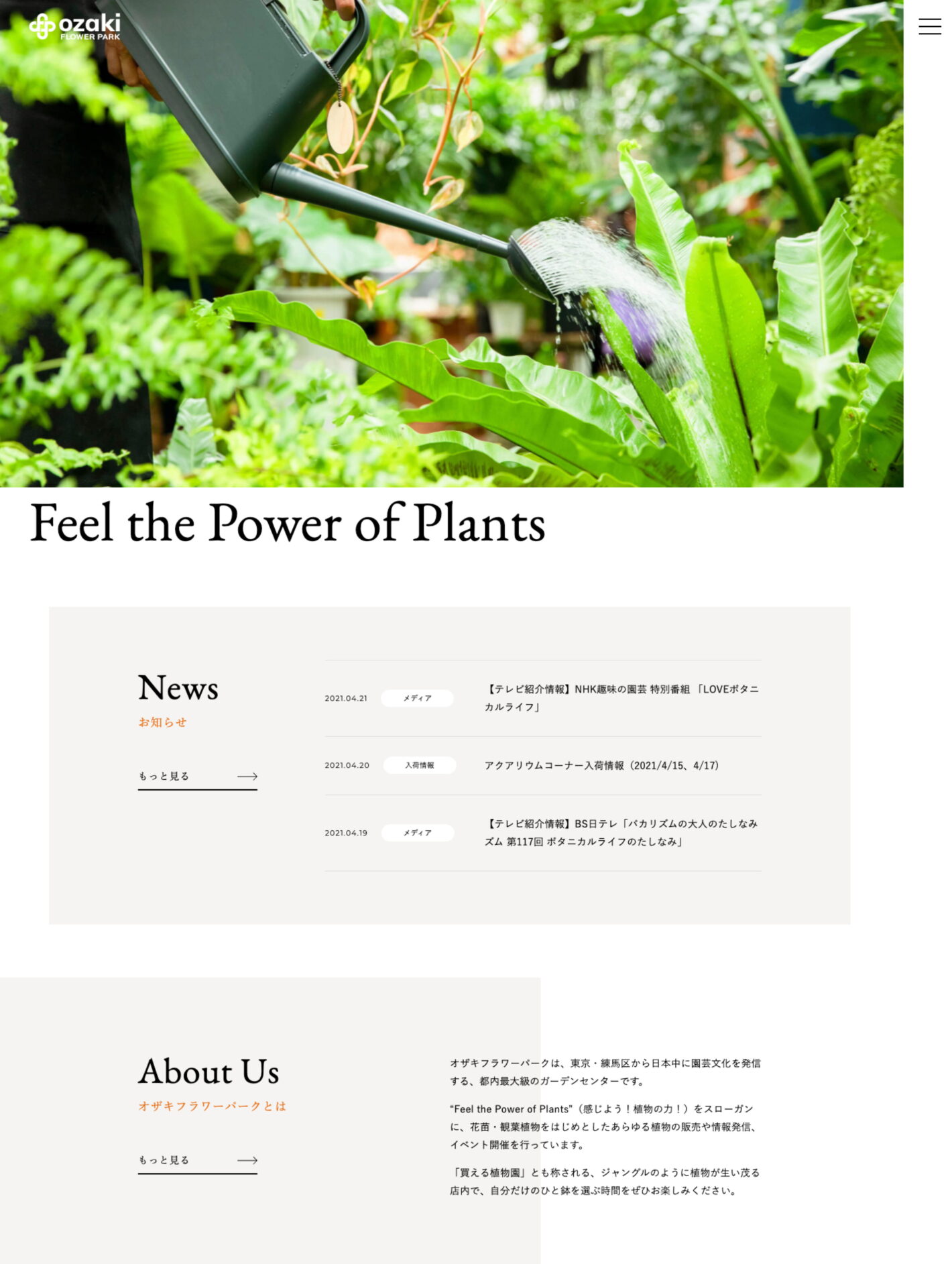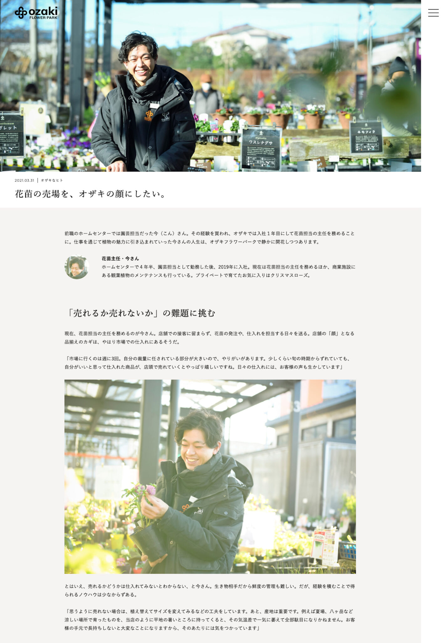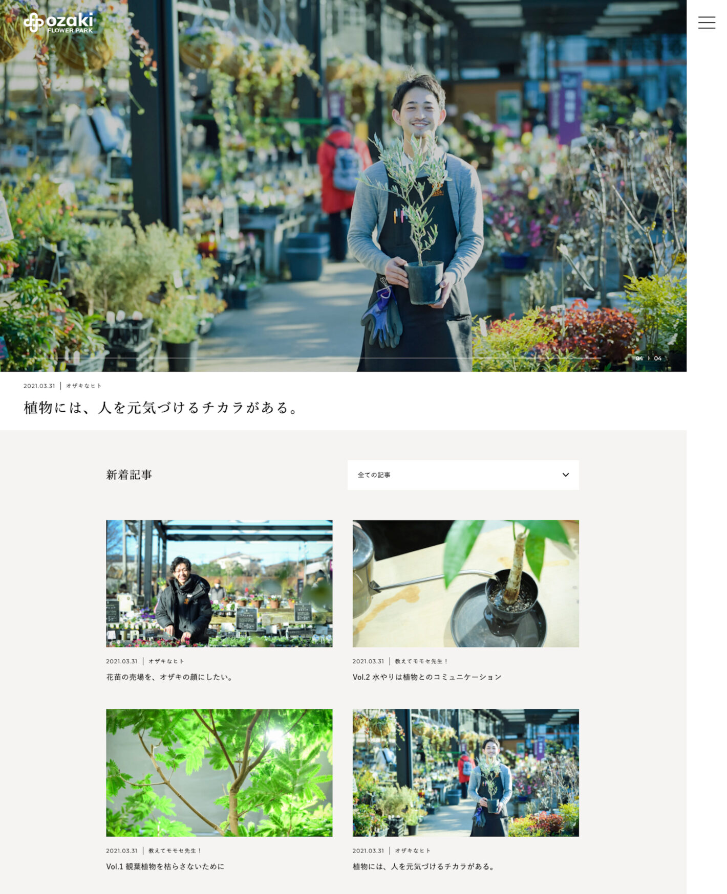 首都圏で最大級の園芸専門店、オザキフラワーパーク様のホームページをフルリニューアル。ダイナミックな写真で緑と花に囲まれた売り場の魅力を表現したほか、働く人にフォーカスしたオリジナルWebマガジン「オザキ通信」を新設しました。