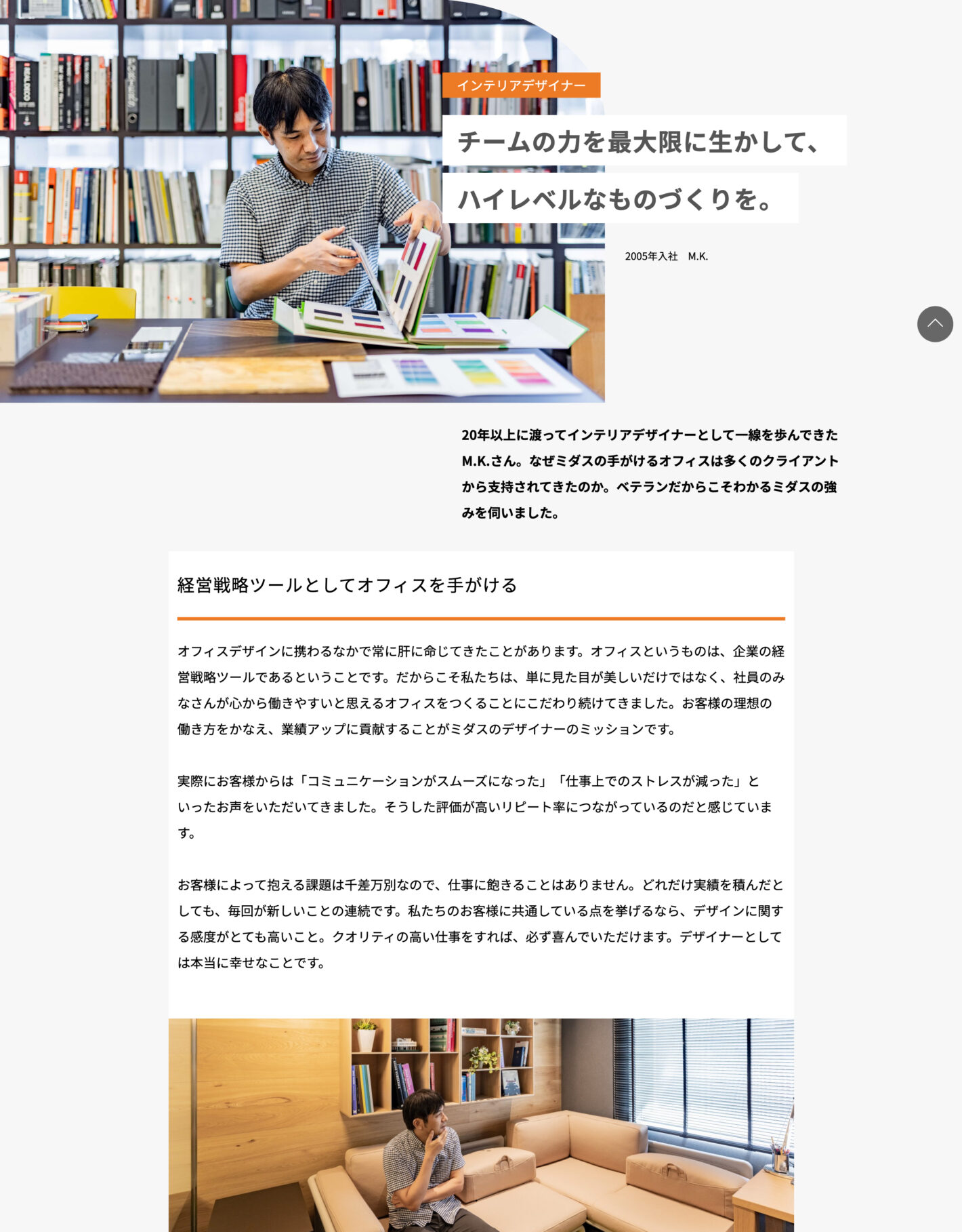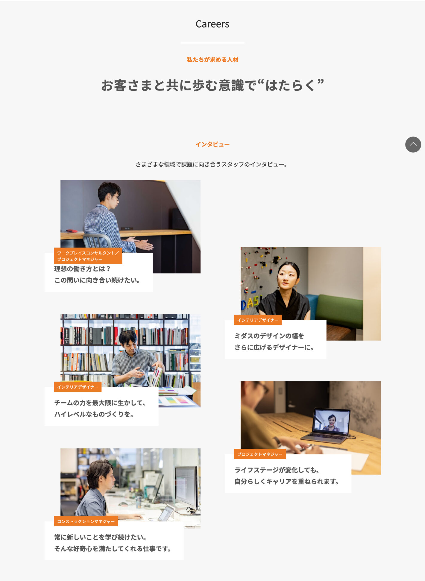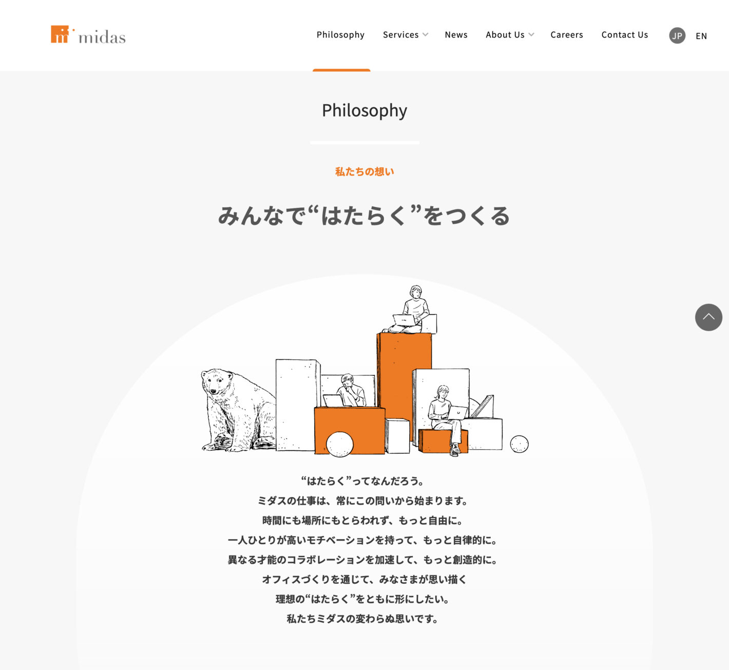 「働く人」を中心にしたオフィスづくりを追求するミダス様。サービス紹介をはじめとしたコピーライティング全般と、採用コンテンツのインタビュー・執筆を担当しました。「みんなで“はたらく”をつくる」という新たなフィロソフィーも策定しています。