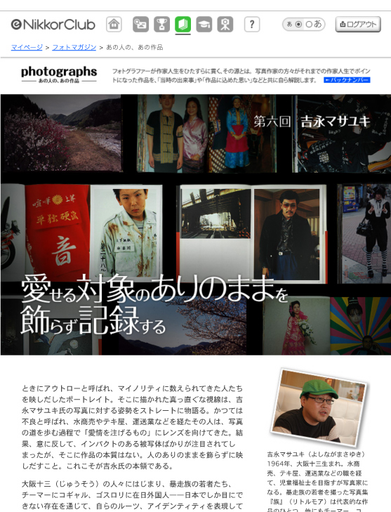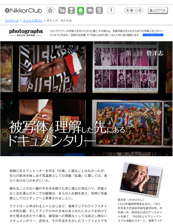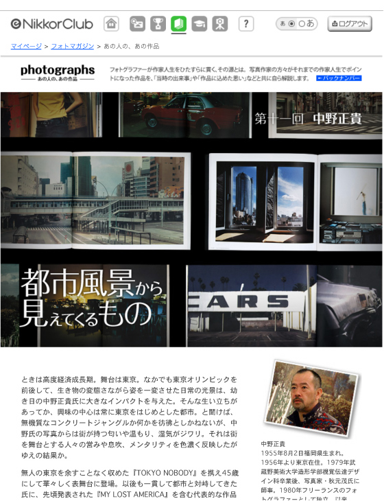 ニコン発のオンラインマガジンでレギュラー展開される「あの人の、あの作品」で、管洋志氏、中村征夫氏、吉永マサユキ氏、ブルース・オズボーン氏、中野正貴氏、ハナブサ・リュウ氏をはじめ12人の写真家を取材、執筆しました。