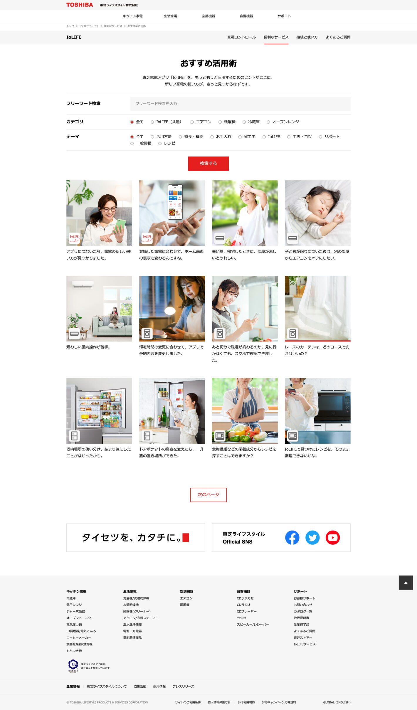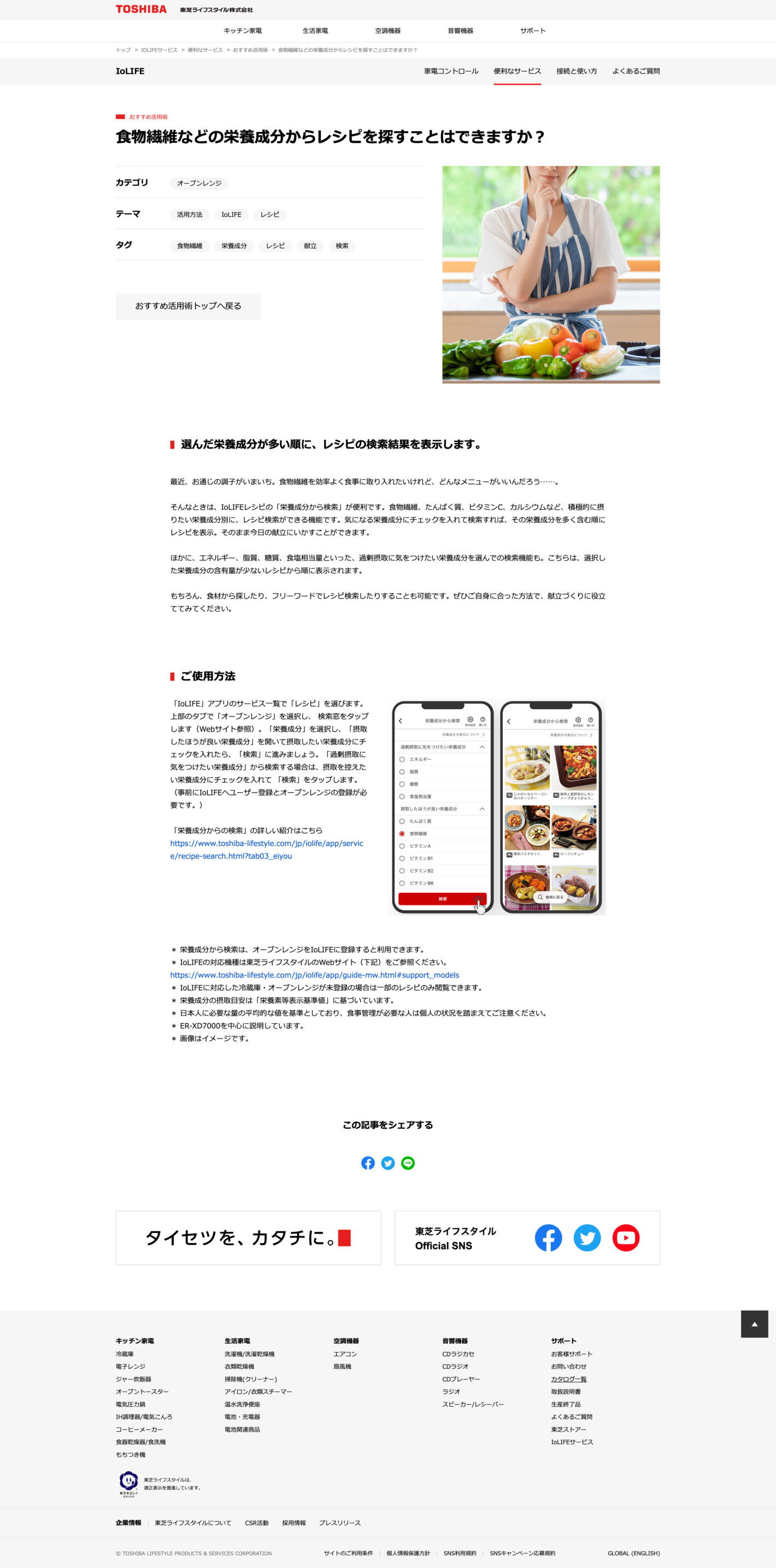 東芝ライフスタイルアプリ内コンテンツ編集執筆 アートディレクション/デザイン:SKG株式会社 インタビュー、執筆・編集:株式会社フリッジVisit Website 制作実績一覧 家電の操作や運転状況のチェックが遠隔でできるアプリ「IoLIFE」を賢く使いこなすためのヒント「おすすめ活用術」全140本の取材、ライティングを担当させていただきました。