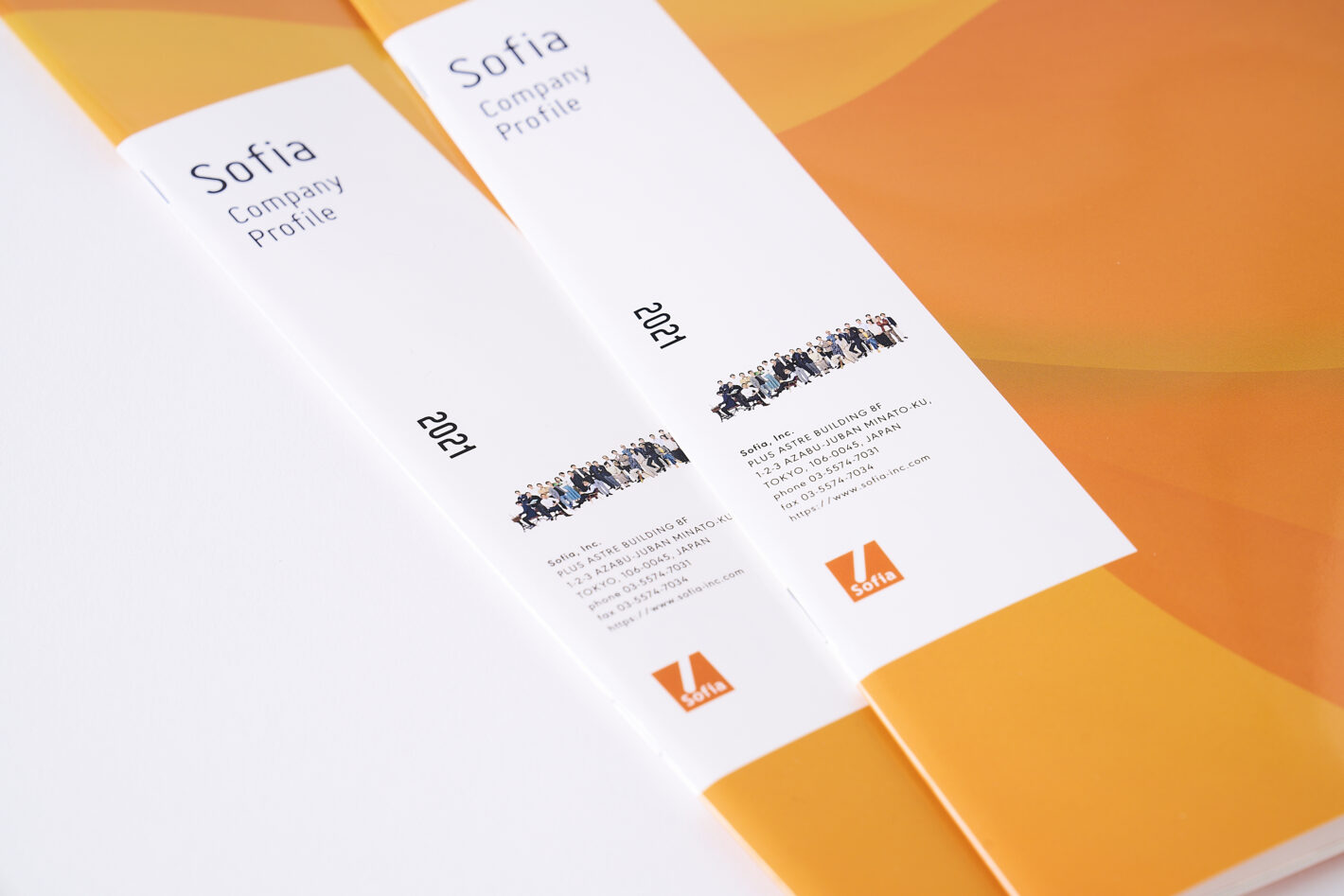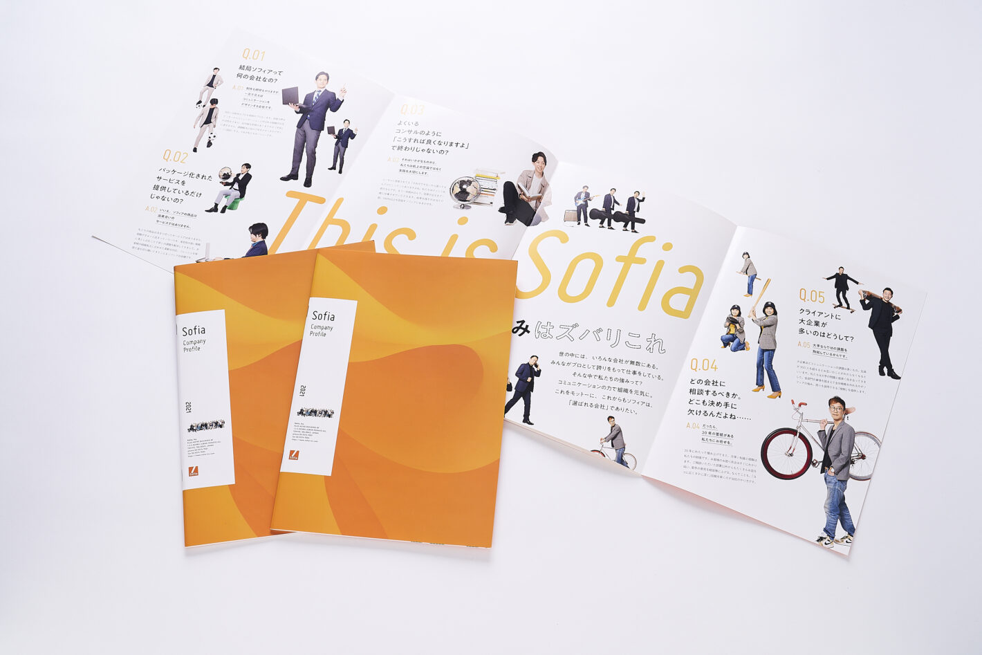 さまざまなプロフェッショナルが集う社内の様子をビジュアライズした会社案内を制作。表2と表2対向ページは観音開きにすることでインパクトのあるページ展開にしました。