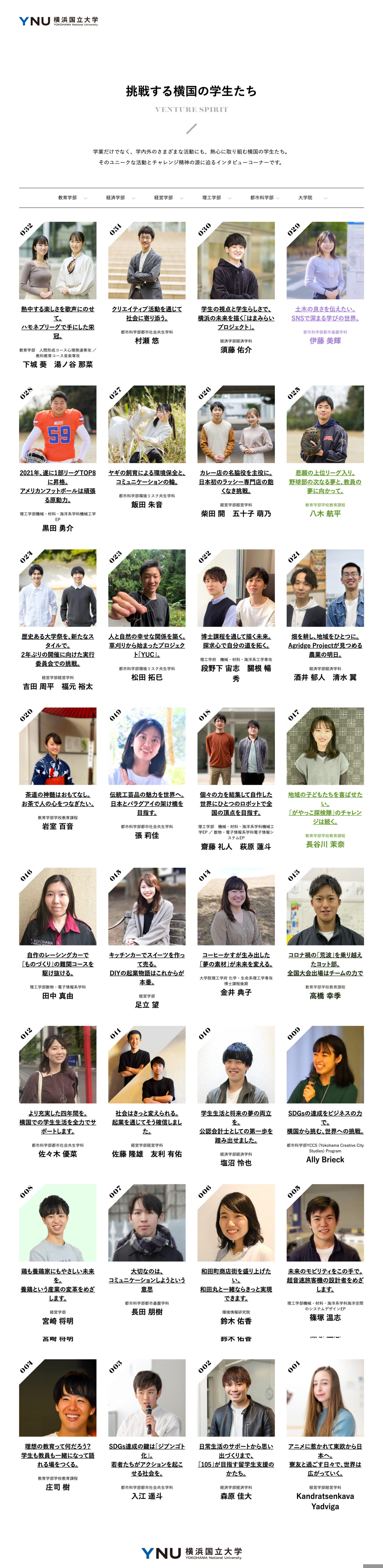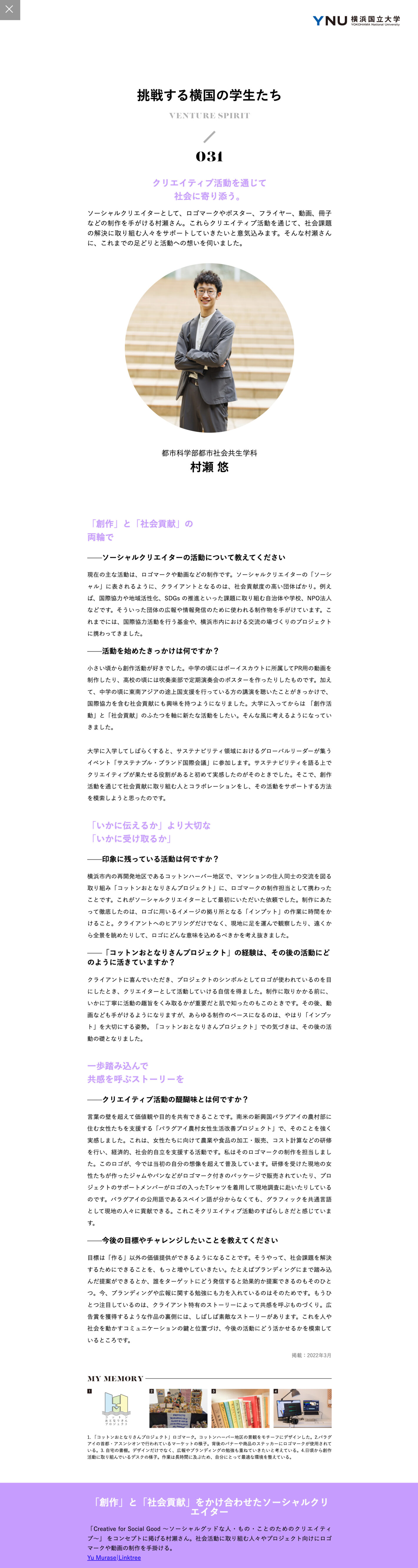国立大学法人横浜国立大学インタビューコンテンツ「挑戦する横国の学生たち」執筆大学関係 取材、執筆:株式会社フリッジ 撮影:榊智朗 制作実績一覧 2020年度より現在にかけて、30本以上のインタビュー記事を担当してきました。