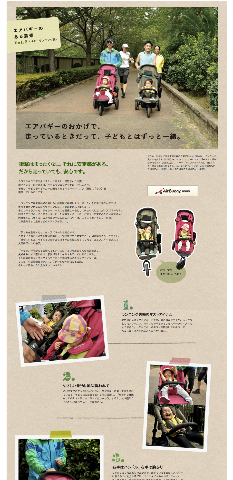 アクティブな家族にぴったりな三輪ベビーカー、エアバギーとユーザーの日常を切り取った取材記事。取材、執筆、デザインを担当しました。