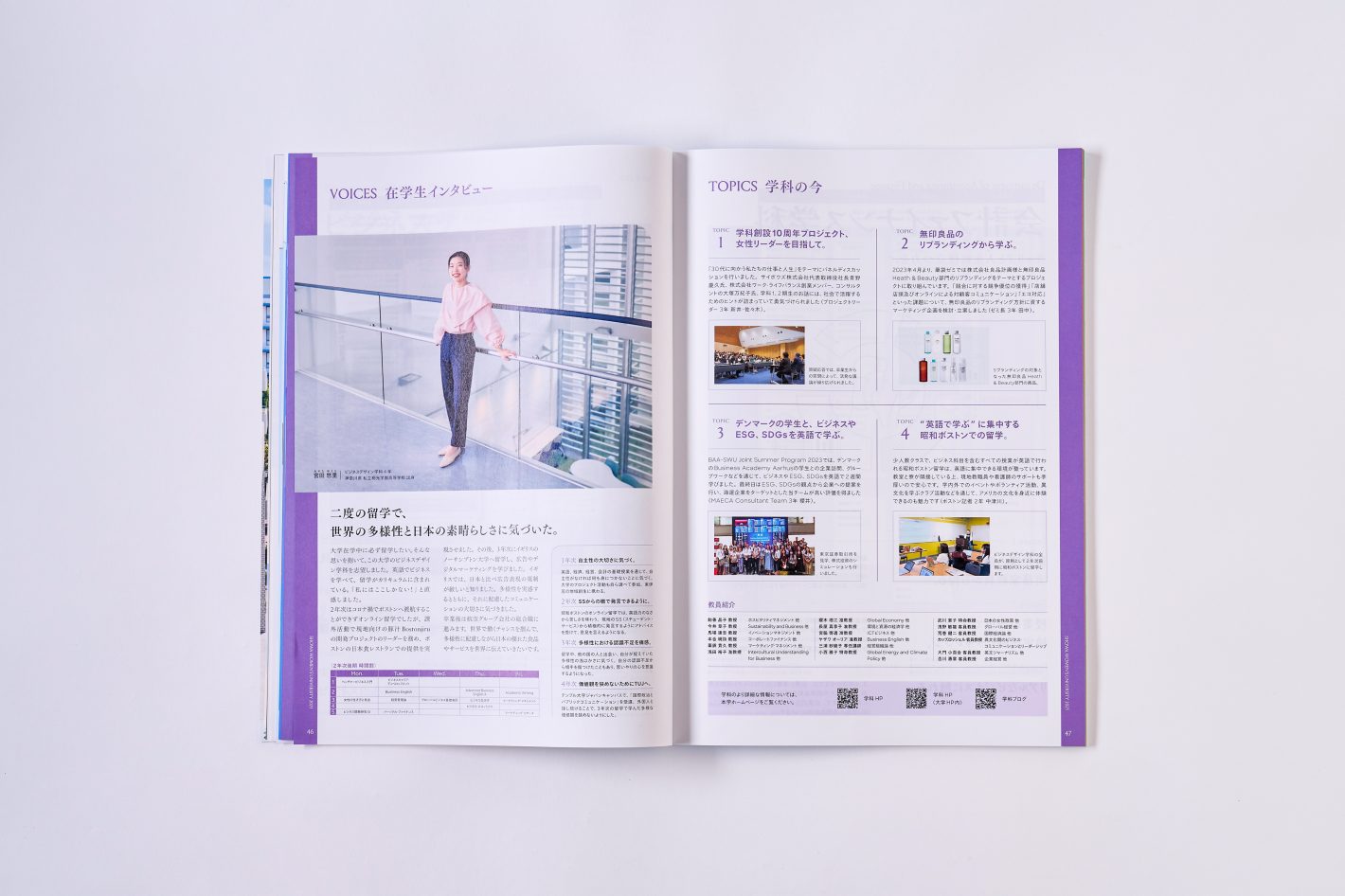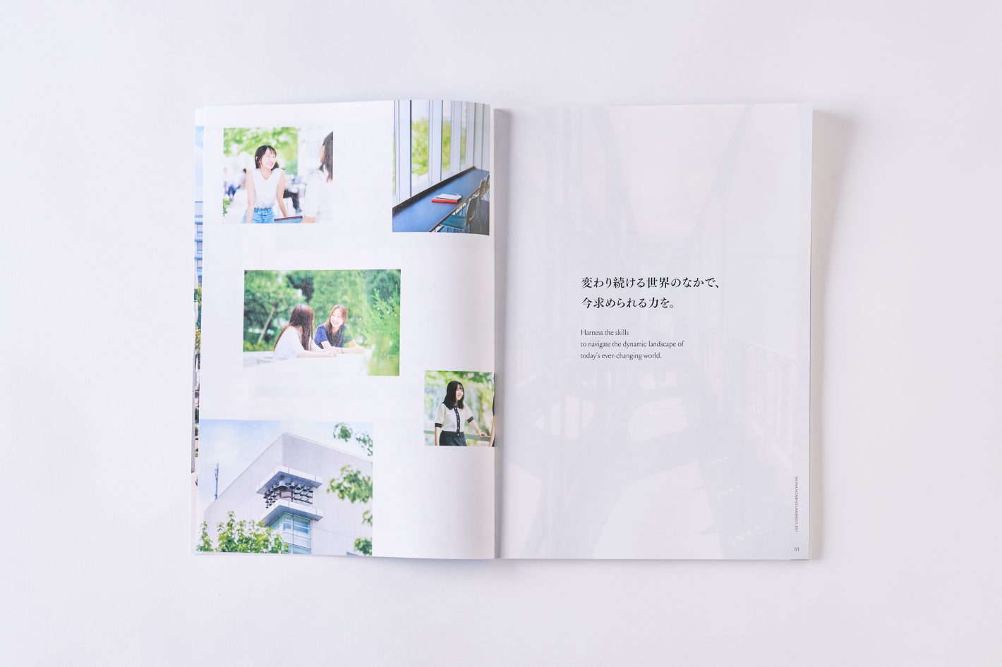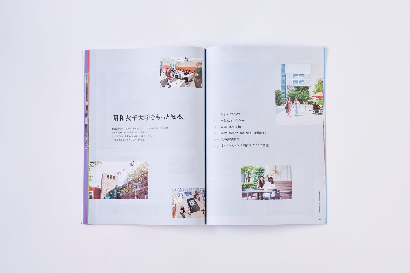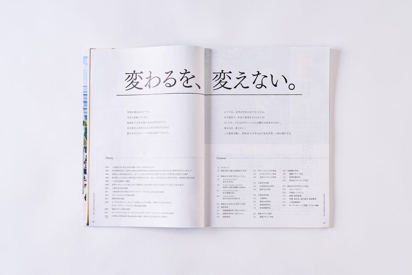 女子大離れが著しい昨今において、積極的な変革を続けることでプレゼンスを高めてきた昭和女子大学の大学案内をリニューアル。「変わるを、変えない」という骨太なメッセージを中心に据え、コピーワークを展開。前任からバトンタッチされた際に行ったのは、ページネーションの根本的な変更、およびコピーワークの大幅な見直し、適切なエディトリアルデザインなど。クライアントとの対話を重ね、基本を徹底することでクオリティの底上げをはかりました。