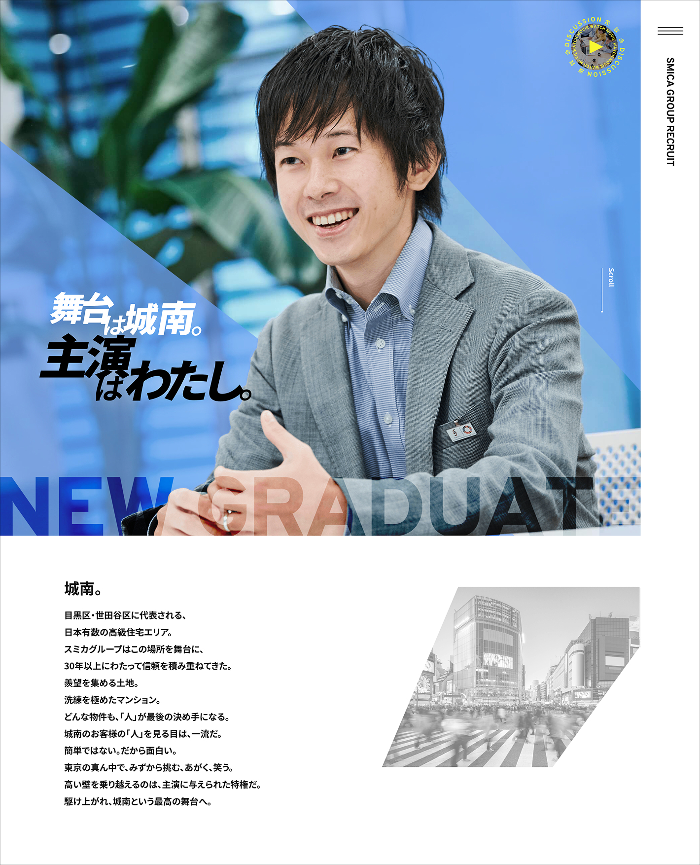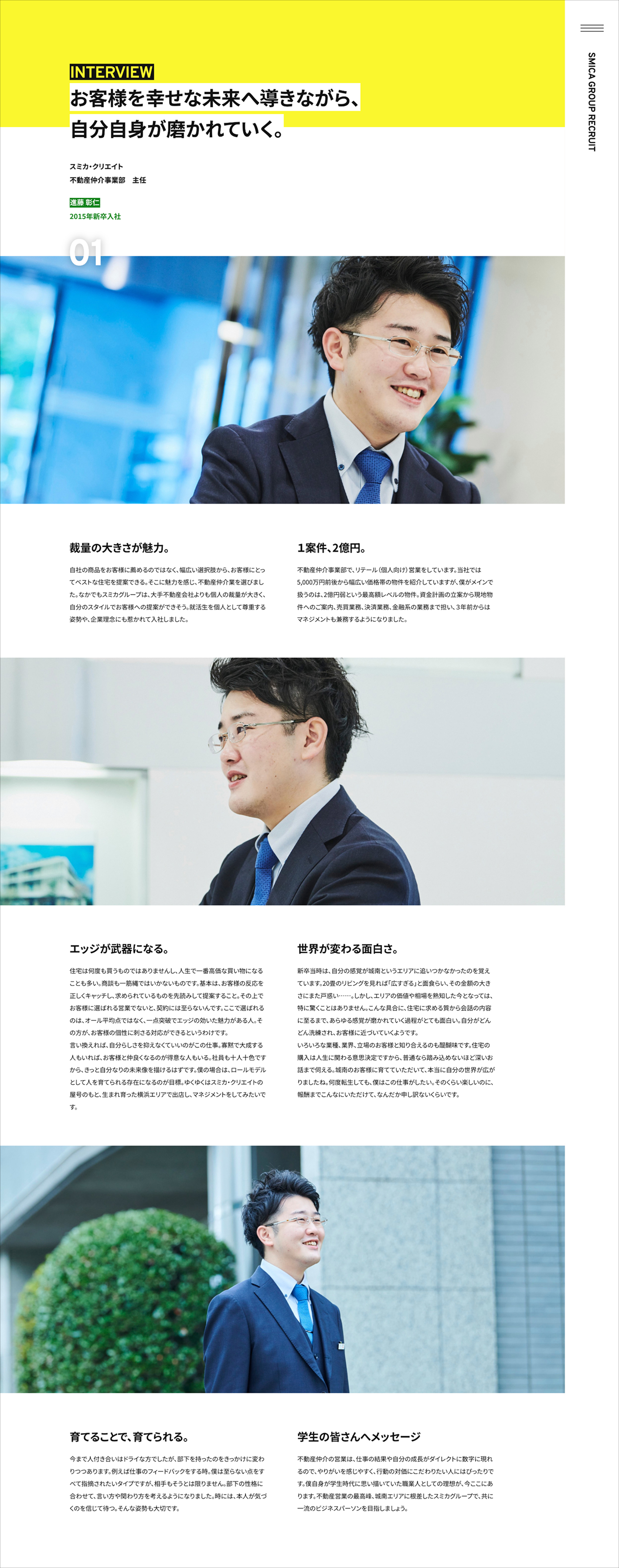 東京・中目黒に本社を構え、城南エリアに密着した不動産事業を展開する株式会社スミカ。採用メッセージの策定、先輩社員のインタビューと執筆、および代表メッセージの執筆を担当しました。メインターゲットは、主体性があり、成長意欲が旺盛な大学生です。城南という最高峰のエリアを新卒1年目から担当でき、パワフルな自己実現を果たせるという同社の魅力を訴求しました。