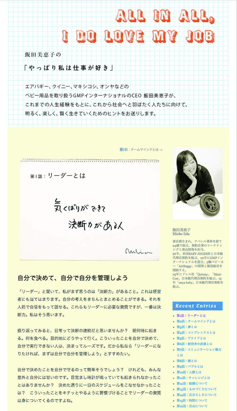国産の三輪ベビーカー、エアバギーで知られるGMPインターナショナルの代表取締役、飯田美恵子社長のブログ記事を約20回に渡り、インタビュー、執筆させていただきました。