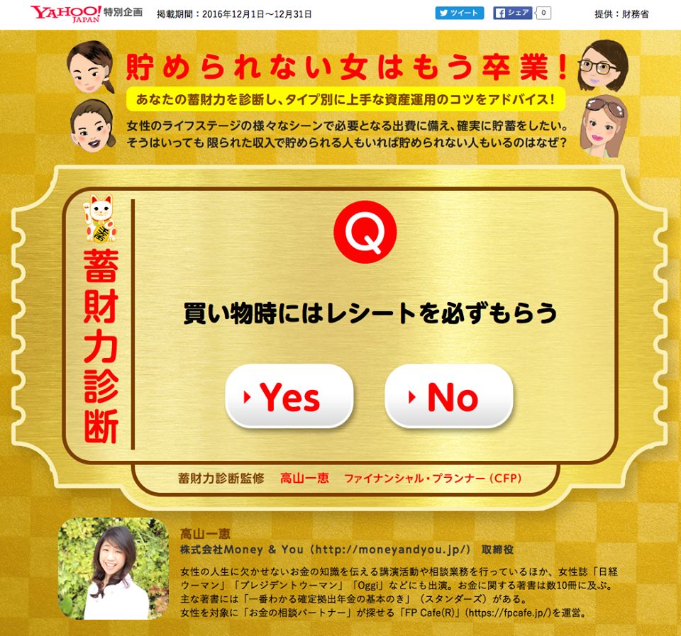 ヤフー株式会社Yahoo! 特別企画編集執筆 P: 宮川千春 WR:高山一恵 ED:立古和智(fridge Inc.)Visit Website 制作実績一覧 女性をターゲットにした蓄財についてのノウハウを伝える記事広告企画。ファイナンシャルプランナーの高山一恵さんを監修にお招きして企画、編集などに携わらせていただきました。